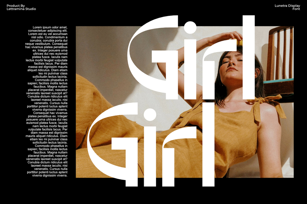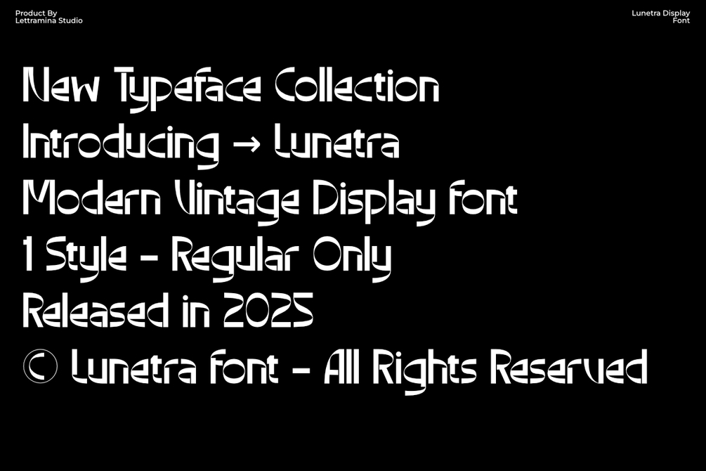 Released in 2025, Lunetra features a single Regular style, making it simple yet striking in its expression. Whether you're creating minimalist lookbooks or bold typographic posters, Lunetra brings refined charm and unique identity to your project.