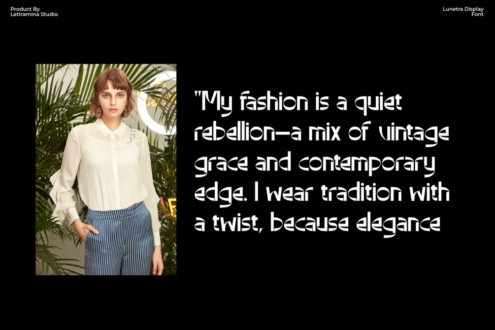 Lunetra is a modern vintage display font that blends timeless elegance with contemporary flair. Designed with smooth curves, sharp edges, and a sense of confident femininity, Lunetra is perfect for fashion branding, editorial headlines, logo designs, and luxury packaging.